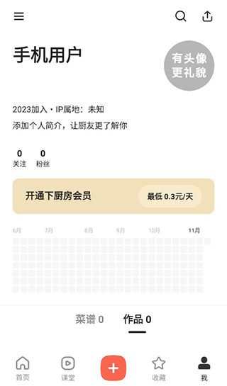 用户点击下方我的即可进入个人中心,可以查看自己的菜谱和作品,以及自己的账号信息