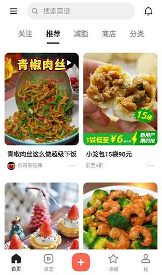 用户登录后会进入首页,在首页用户可以查看其他人分享的做菜方法,还可以制作减脂套餐等。