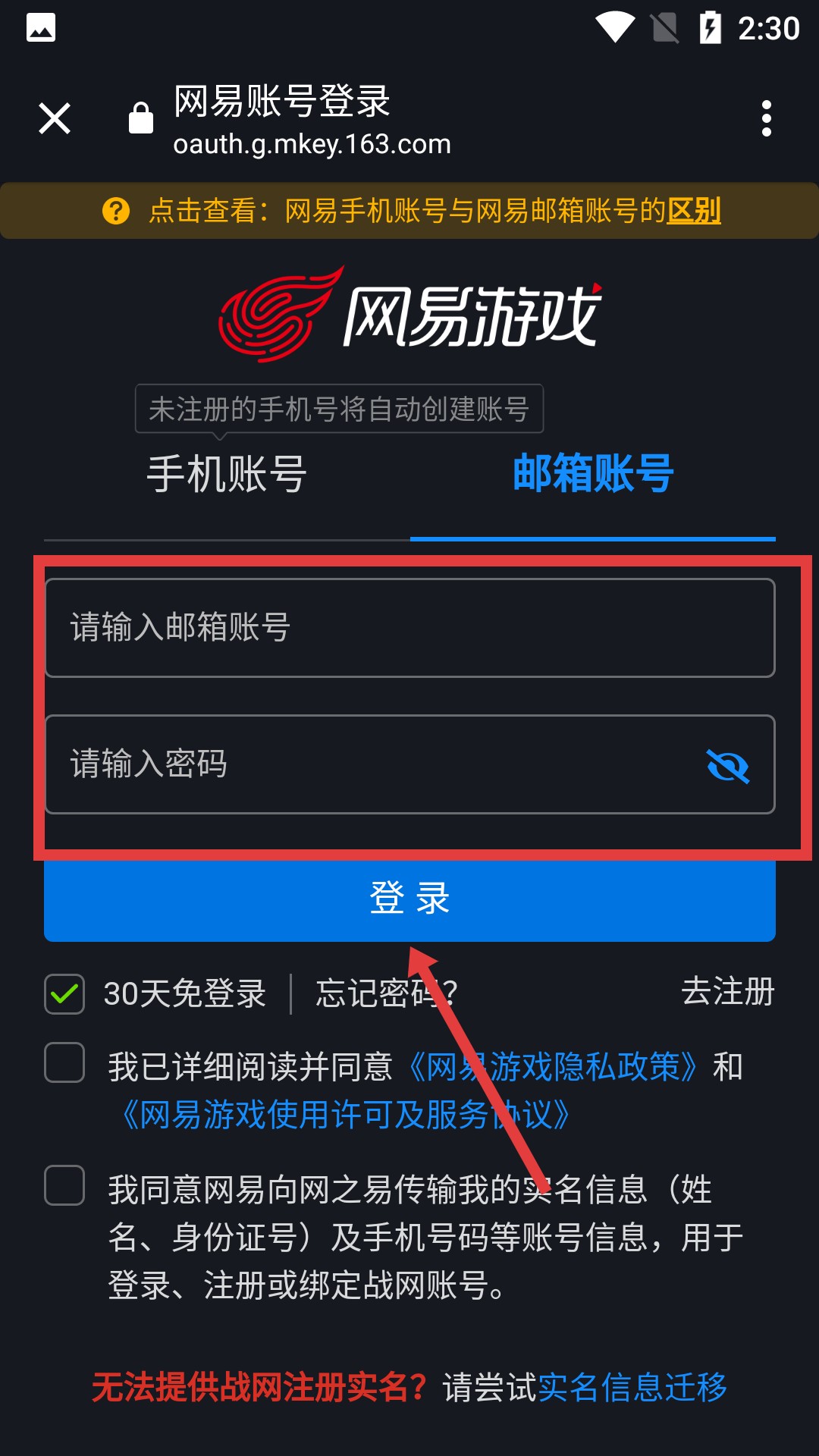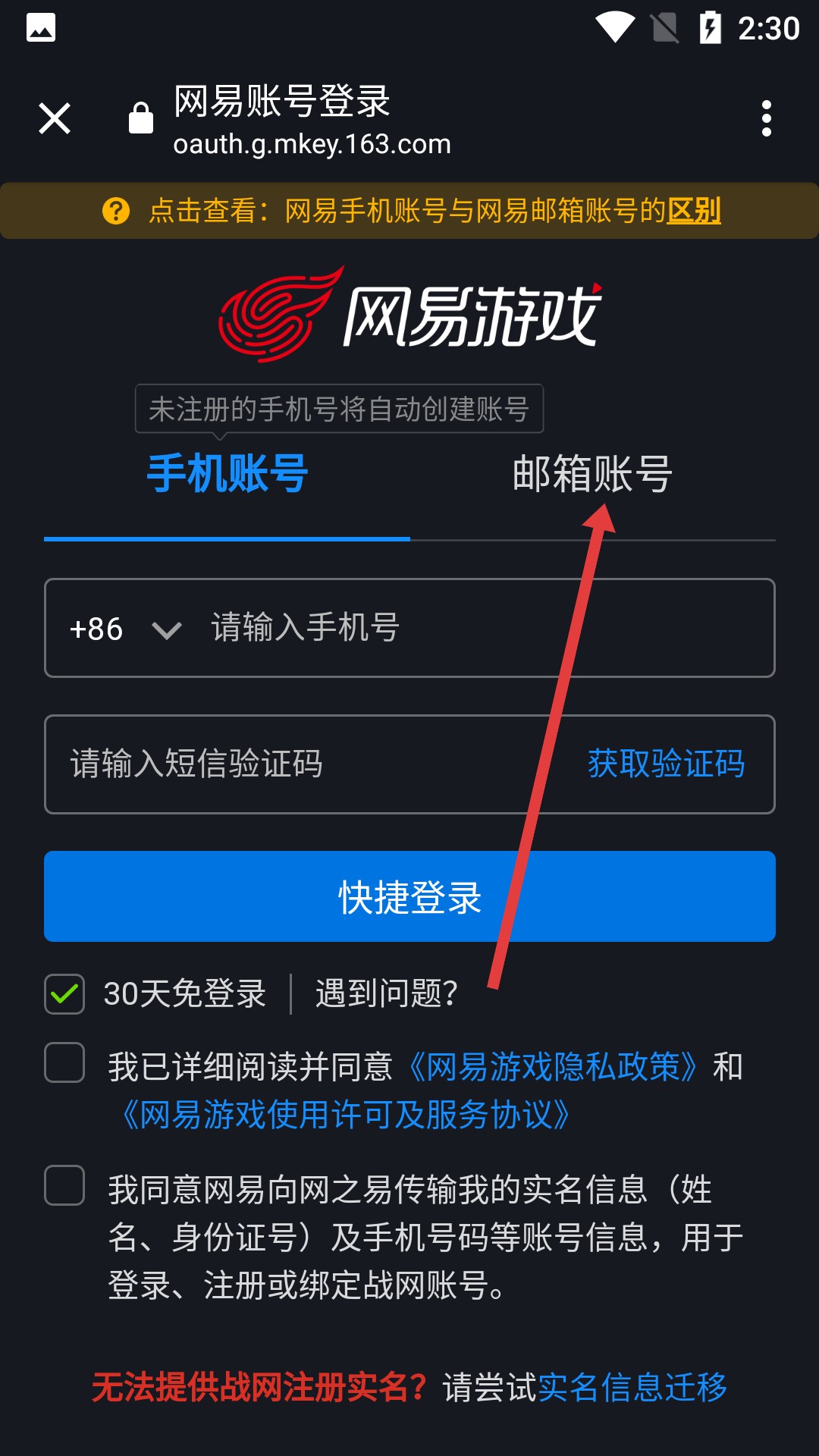 3、在登录页面点击【邮箱账号】,切换至邮箱登录页面。