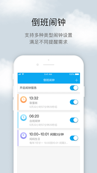 1.支持倒班闹钟、条件闹钟等多种与倒班信息相关联的闹钟提醒