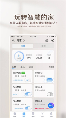 1、智能场景定制,依据个人生活方式,设计专属场景模式,如离家、回家自动调整设备状态。